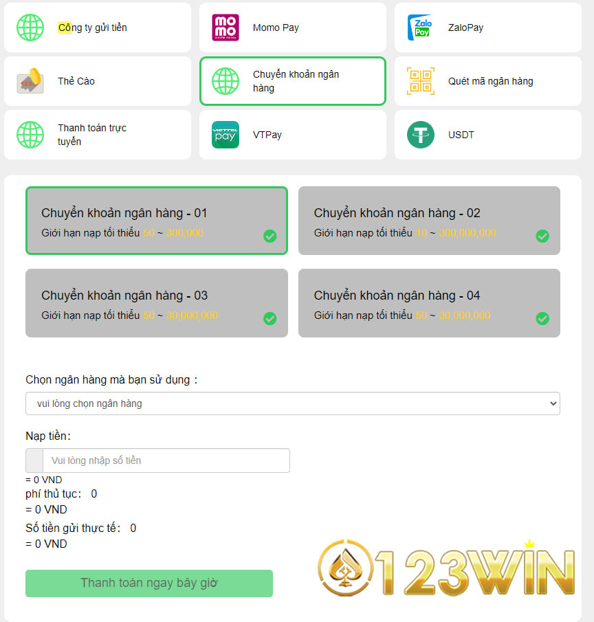 Đây là tâm lý chung của tất cả người chơi ở tất cả các nhà cái. Và dĩ nhiên nhà cái nào sở hữu tốc độ rút nhanh chóng sẽ được đông đảo mọi người yêu quý. Và không làm anh em chờ lâu, sau đây là các bước hướng dẫn anh em nạp tiền vào nhà cái 123win pro.