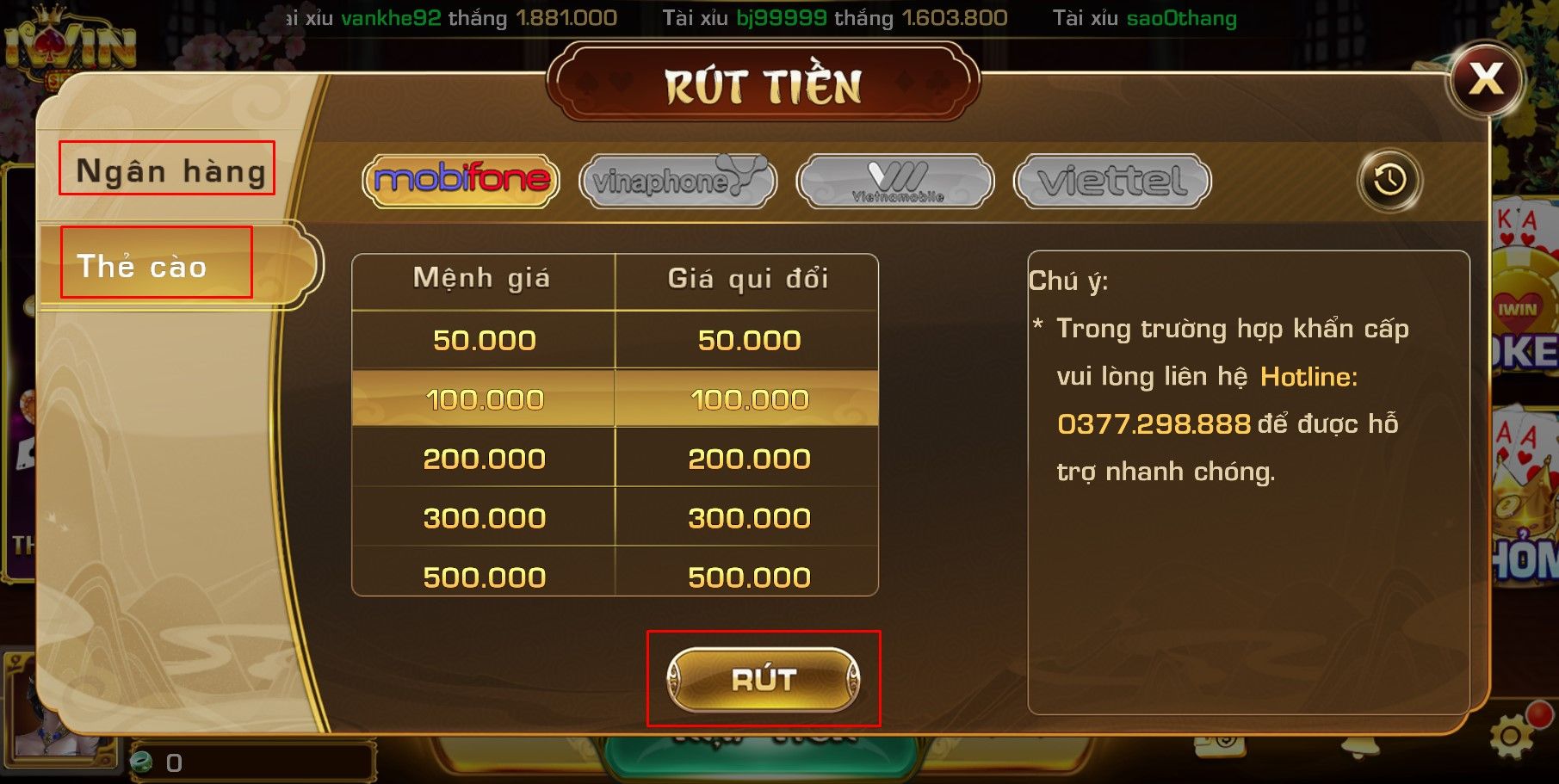 Hướng dẫn cách rút tiền iWin Club về mạng Vietnamobile