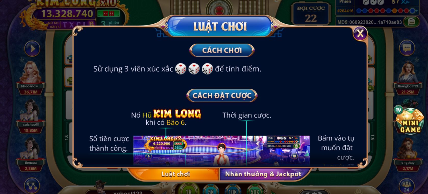 • Có tất cả 4 tụ cược trong tựa game, chúng bao gồm: tụ tài, xỉu, chẵn và lẻ. Nếu anh em cược tụ tài thì anh em sẽ thắng khi tổng kết quả 3 mặt xúc xắc ra 11 đến 17 điểm. Thắng tụ xỉu khi tổng kết quả xúc xắc có từ 4 đến 10 điểm. Về phần chẵn và lẻ thì sẽ tùy vào kết quả mà xác định.